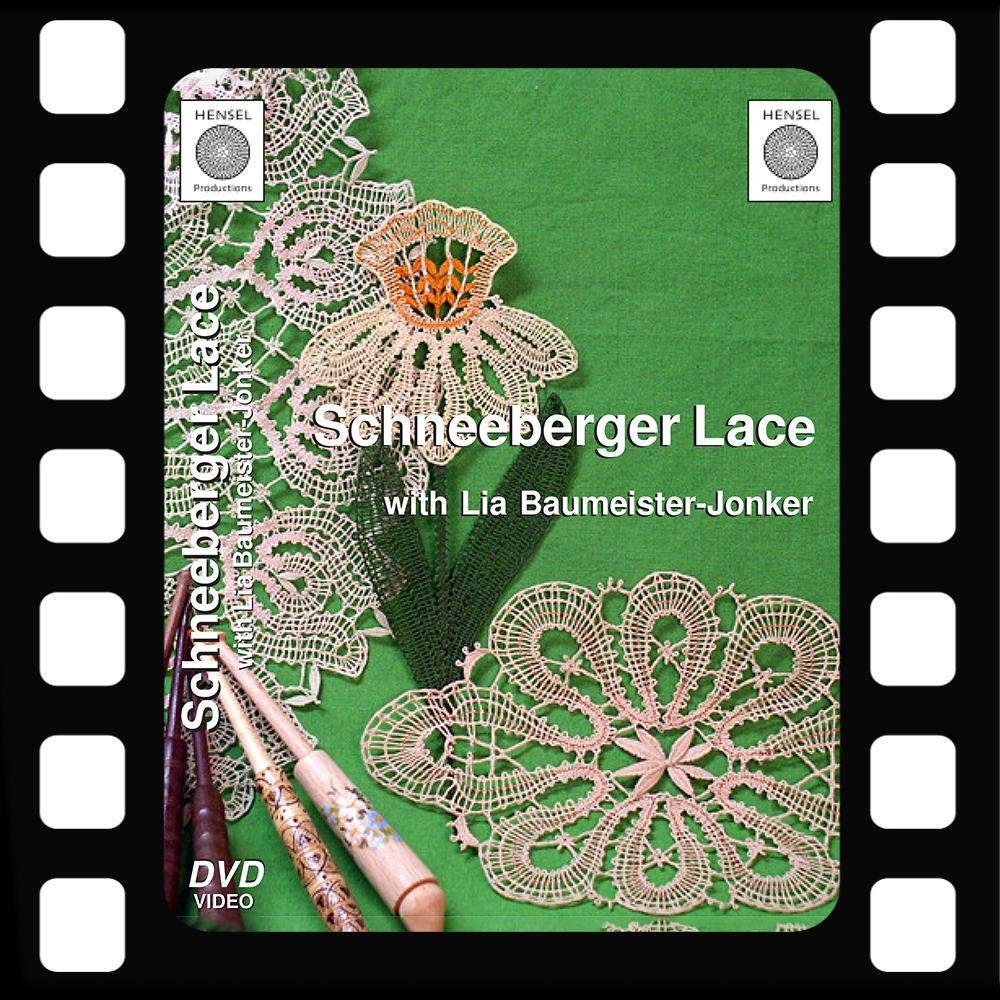 In this DVD video program, Lia introduces you to this popular lace from the Erzgebirge region of Germany, with background information on how this lace came to be made in this area. Four patterns are used to demonstrate how to make Schneeberger lace: two edgings, a flower motif, and a mat. Each of the following techniques is clearly shown using diagrams and demonstrations: starting the lace, 3-pair crossings, adding pairs for the outside plait, working the outside plait and connecting it to the lace, false plaits, working leaves, making crescent-shaped leaves, working around corners in both cloth stitch and whole stitich, working a Schneeberger dip, 4-pair crossings, adding in pairs for the fillings, taking plait pairs through the tape, the Marguerite filling, a leaf filling, sewing out and finishing with bundles. An extra practice pattern is also provided to reinforce using the techniques presented in this program.